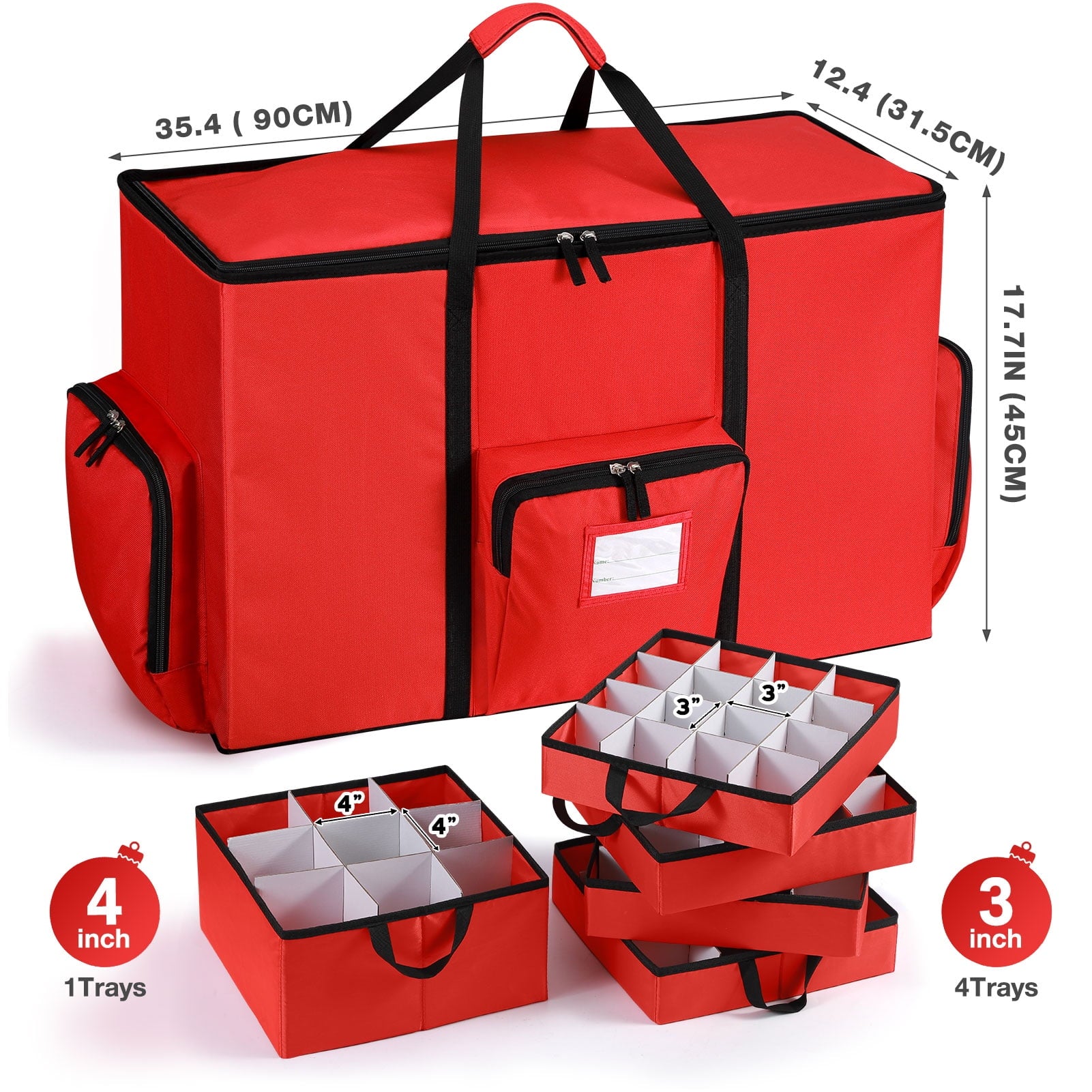 - MULTIPURPOSE ORGANIZER - Have all your Christmas ornaments, figurines, and decorations conveniently stored in one handy organizer. Bins are composed of 5 sectional trays designed with 64 slots that hold 3” ornaments and 9 slots that hold 4” ornaments; adjustable compartments for any size figurines; and pockets for decorations.